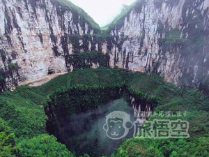 天坑(地元の人は「大石囲」と呼ぶ)は全部で100箇所もあります。最大の天坑は深さ約300m、入口の広さは約6万平方mに達します。楽業県天坑群の形成は300~400万年前のヒマラヤの地表運動にさかのぼります。