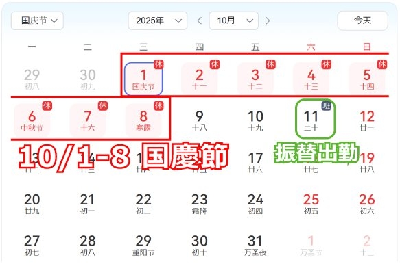 国慶節の営業体制について、以下の通りご案内申し上げます。
