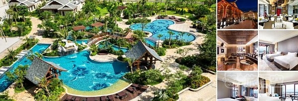 ホテルの外観なお城のような立派な建物です。ホテルの中庭など、中国の伝統的な建築様式の建物もあります。ホテル内にはバーやサンビーチのある大きな屋外プールがあります。客室は全287室で、プライベートプールのあるリッチな客室もあります。※空港から約50分/温泉有