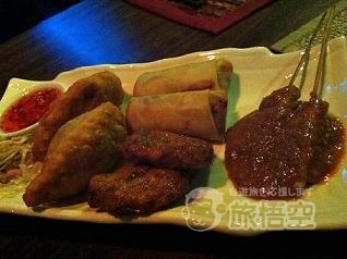 ~前菜盛り合わせ~ 春巻き、サテ、さつま揚げ、サモサの盛り合わせ。 季節のメニューから、~アスパラ&海老の炒め物~や、~ローストチキン~は、 レモングラスやミントの香りが美味。 ~タイ式ツナピザ~は、もち米&卵&ツナのピザ風。 ブルーライトの雰囲気が夜にピッタリ。店員さんのサービスも◎ |